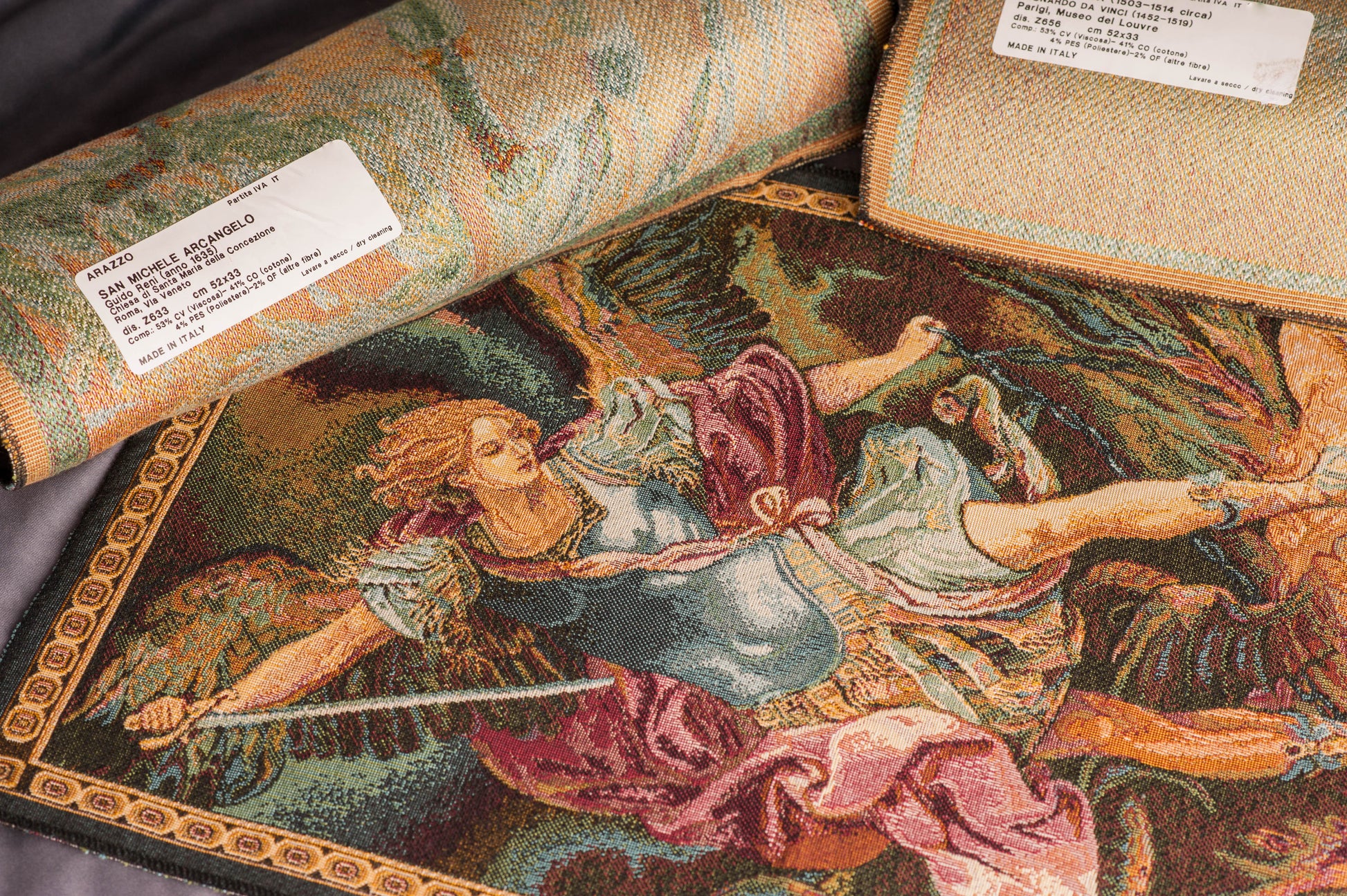 Tecida em Itália em jacquard de alta definição com composição em viscose e algodão, esta reprodução em 52×33 cm preserva a paleta suave e luminosa característica de Reni, onde o azul-esverdeado das vestes e o rosa da armadura dialogam com a exuberância cromática do fundo boscoso. O friso ornamental que enquadra a cena sublinha a origem têxtil nobre da peça, adequada à moldura ou à exposição avulsa em superfícies planas.