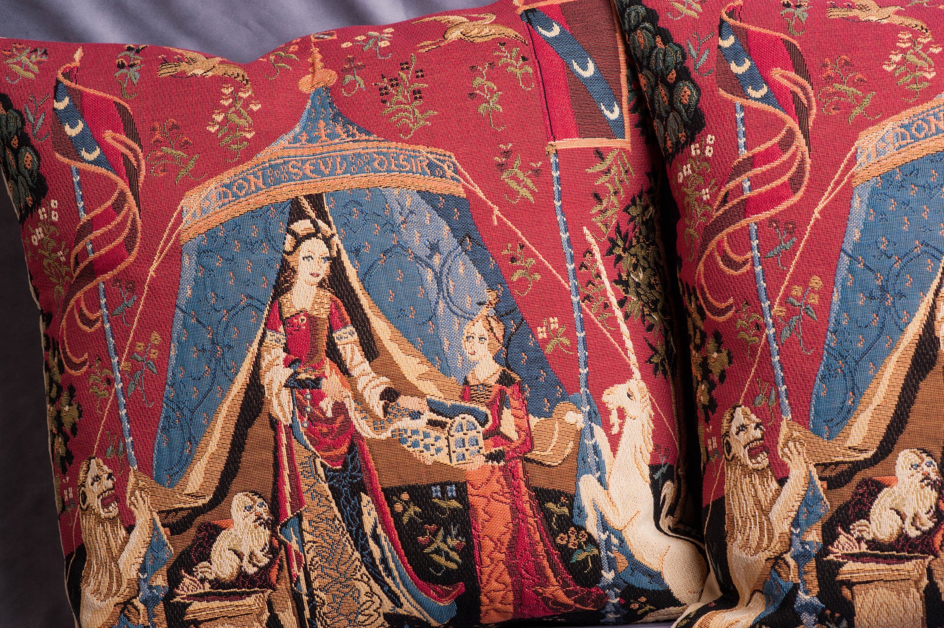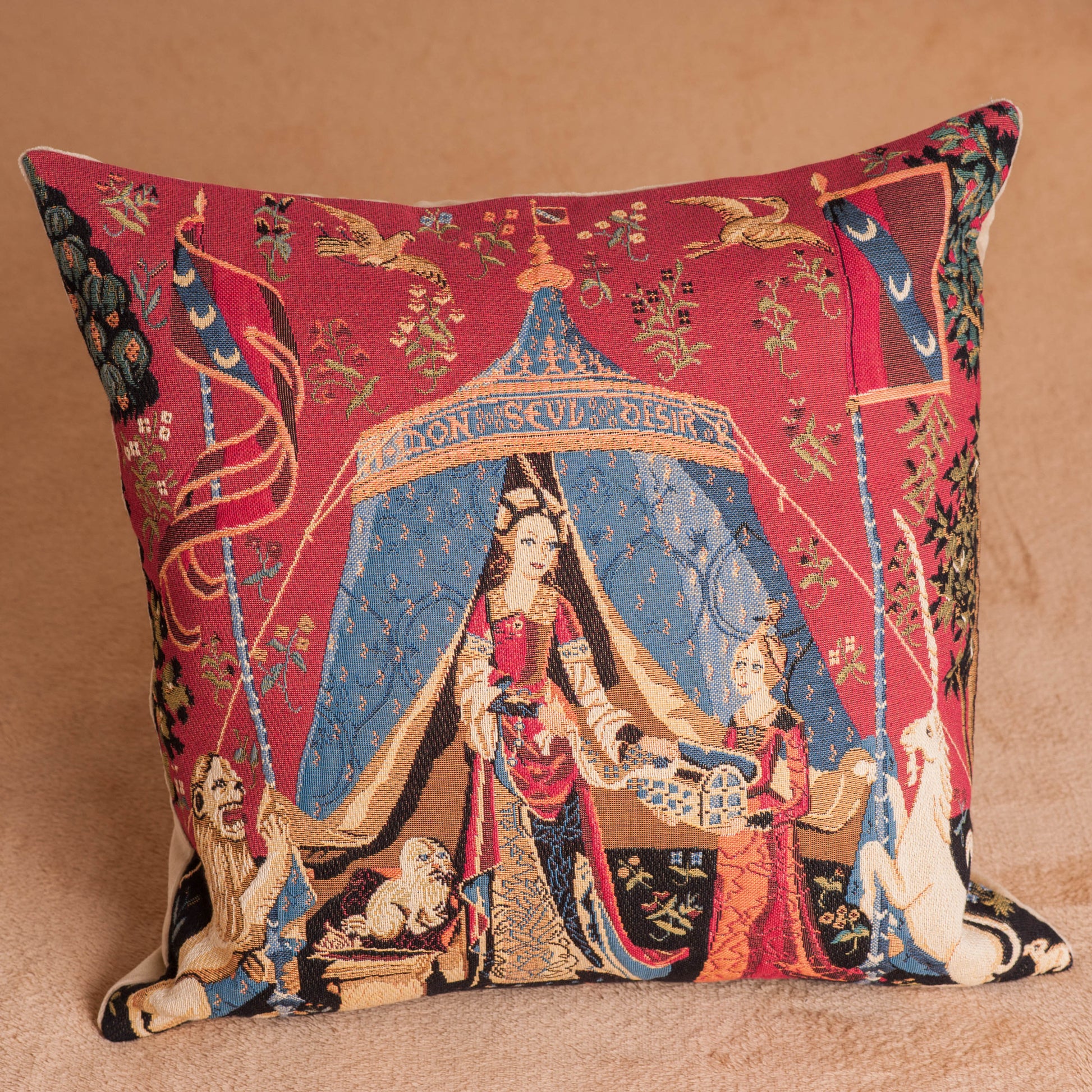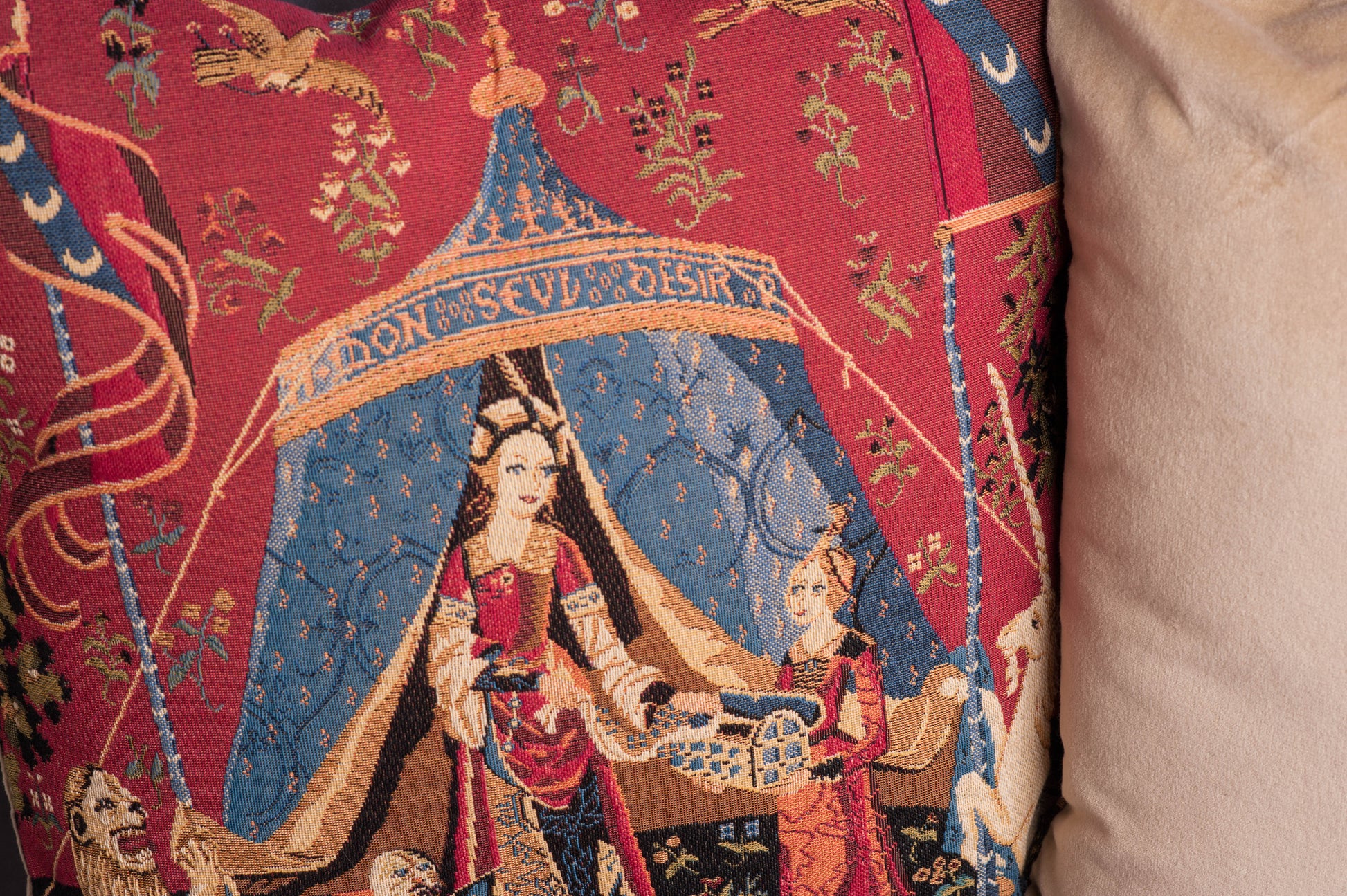 Reproduzida a partir da mais enigmática das seis tapeçarias da série La Dame à la Licorne, tecida originalmente nas Flandres do século XV e hoje guardada no Musée de Cluny em Paris, esta peça traz para o ambiente doméstico um dos símbolos mais refinados da sensibilidade medieval europeia.